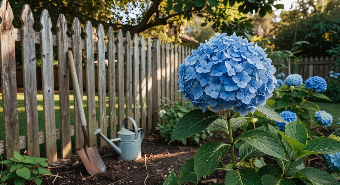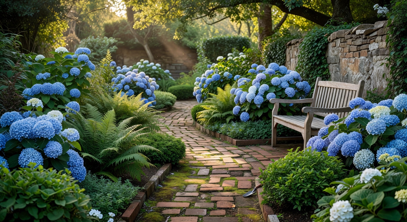 A shaded hollow with eight heritage hydrangea varieties — mostly Endless Summer and Limelight, with a single ancient Annabelle at the center. Fern understory. Soft, even light even on bright days. Especially good for family and senior portraits.