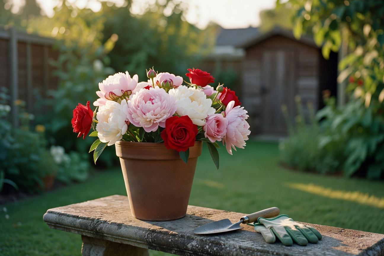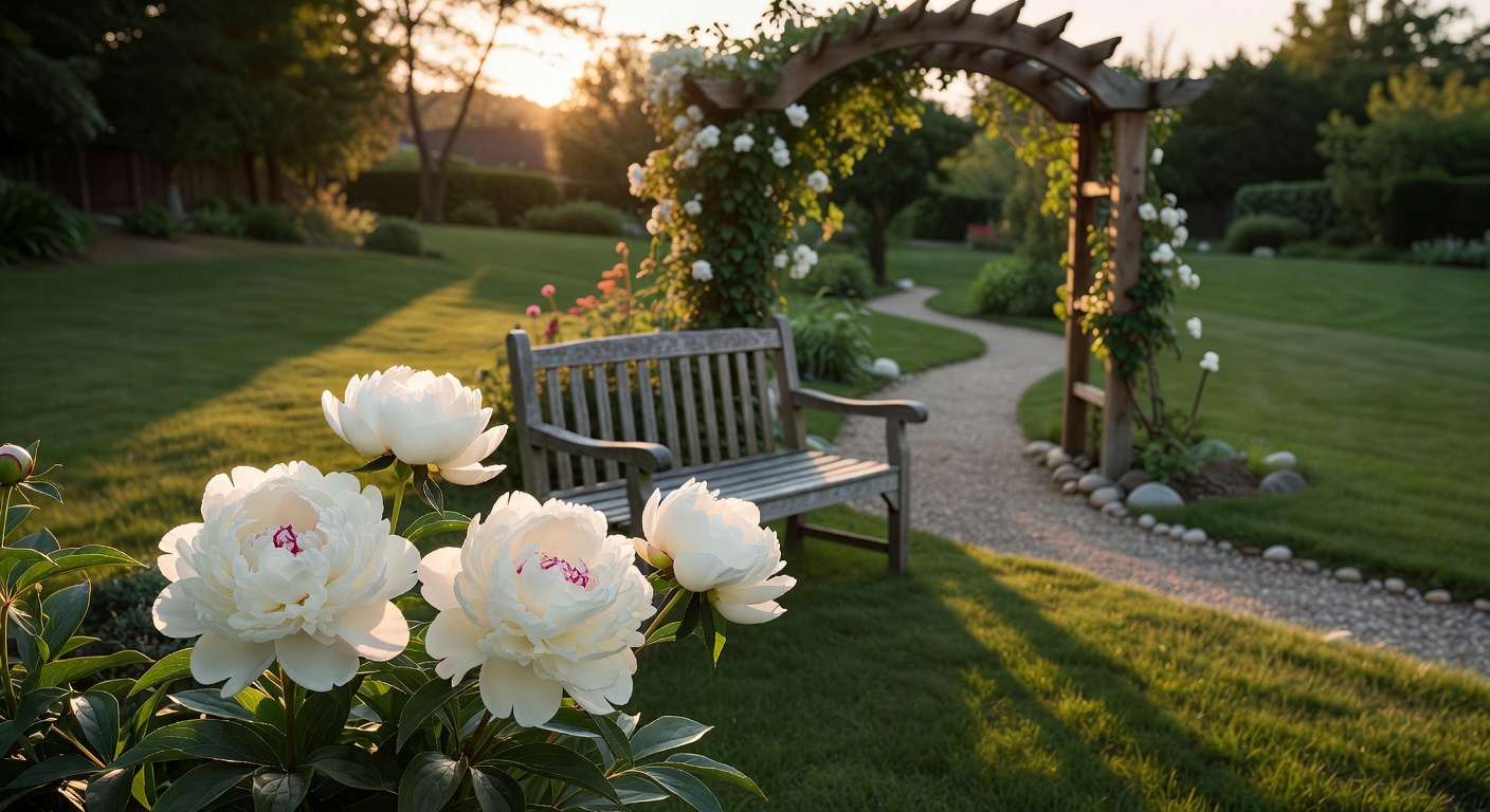 A half-acre cottage garden tended since 2008. Fifteen heirloom peony varieties line the main path, with a vine-covered arbor at the center. Dappled late-afternoon light. Sensible place for small weddings (up to 20) and portrait sessions.